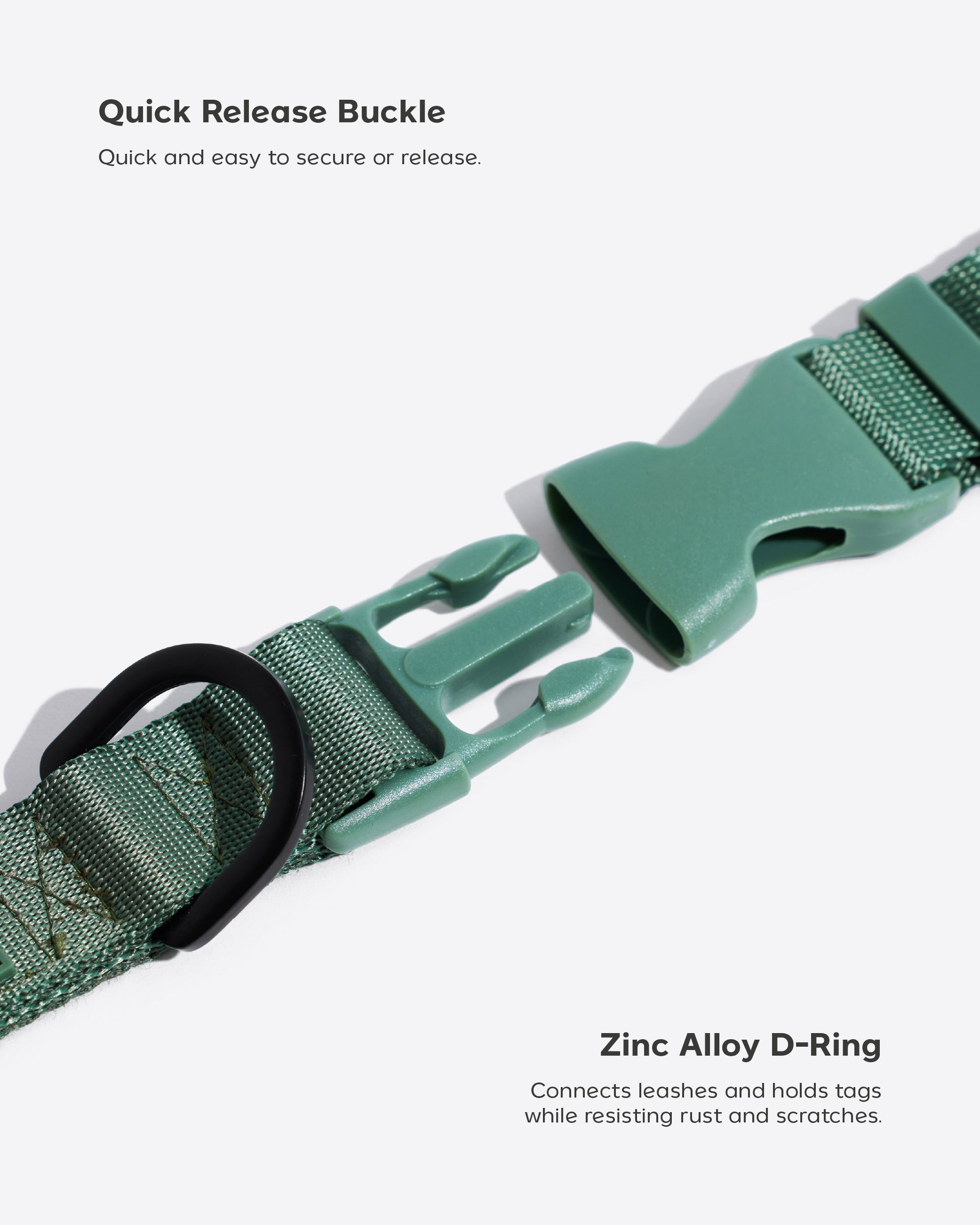 Easy to put on — simply snap the buckle together. Made from high-quality nylon webbing, it’s durable, resistant to pulling and abrasion, water-repellent, does not retain moisture, and is easily adjustable to fit comfortably around your dog’s neck.